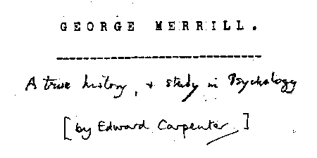 As I have known George Merrill now (5 March, 1913) for some twenty-two years - during fourteen of which he has lived with me as a friend and housekeeper - he has naturally played an important part in my life and I feel impelled to try and put something on the record about him. It is not often perhaps that two people are associated over a longish period so closely as we have been; for though the ordinary man and wife may see a good deal of each other, yet it generally happens that their respective occupations carry them during the day pretty far apart; whereas we have been practically within hail of one another all the time - working side by side in the garden or the house, or at most in adjacent rooms, meeting at nearly every meal, plunging together over the hills to the railway station and into Sheffield, or traveling in England or abroad. And I think it speaks well for both of us that the relation has endured this somewhat severe test: - that is has grown indeed in grace; and that our intimacy, though perhaps a little different in its temporal character, is just as close and sincere to-day as it was twenty years ago.